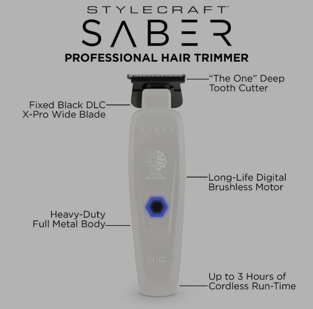 Built on a powerful, long-life digital brushless motor, the Saber trimmer cranks up to 7,500 RPM for the highest torque and the lowest vibration. It cuts smoother, sharper, cooler, and longer without missing a hair.