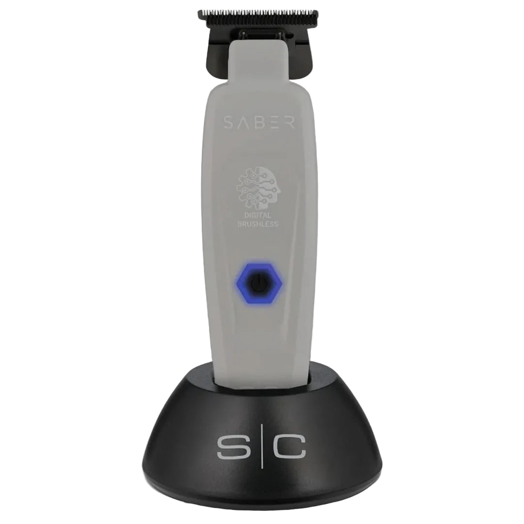 The assembled fixed black DLC X-Pro Wide blade and “The One” moving cutter bring that “crunch” barbers dream about, making the Saber a benchmark for trimmers everywhere.