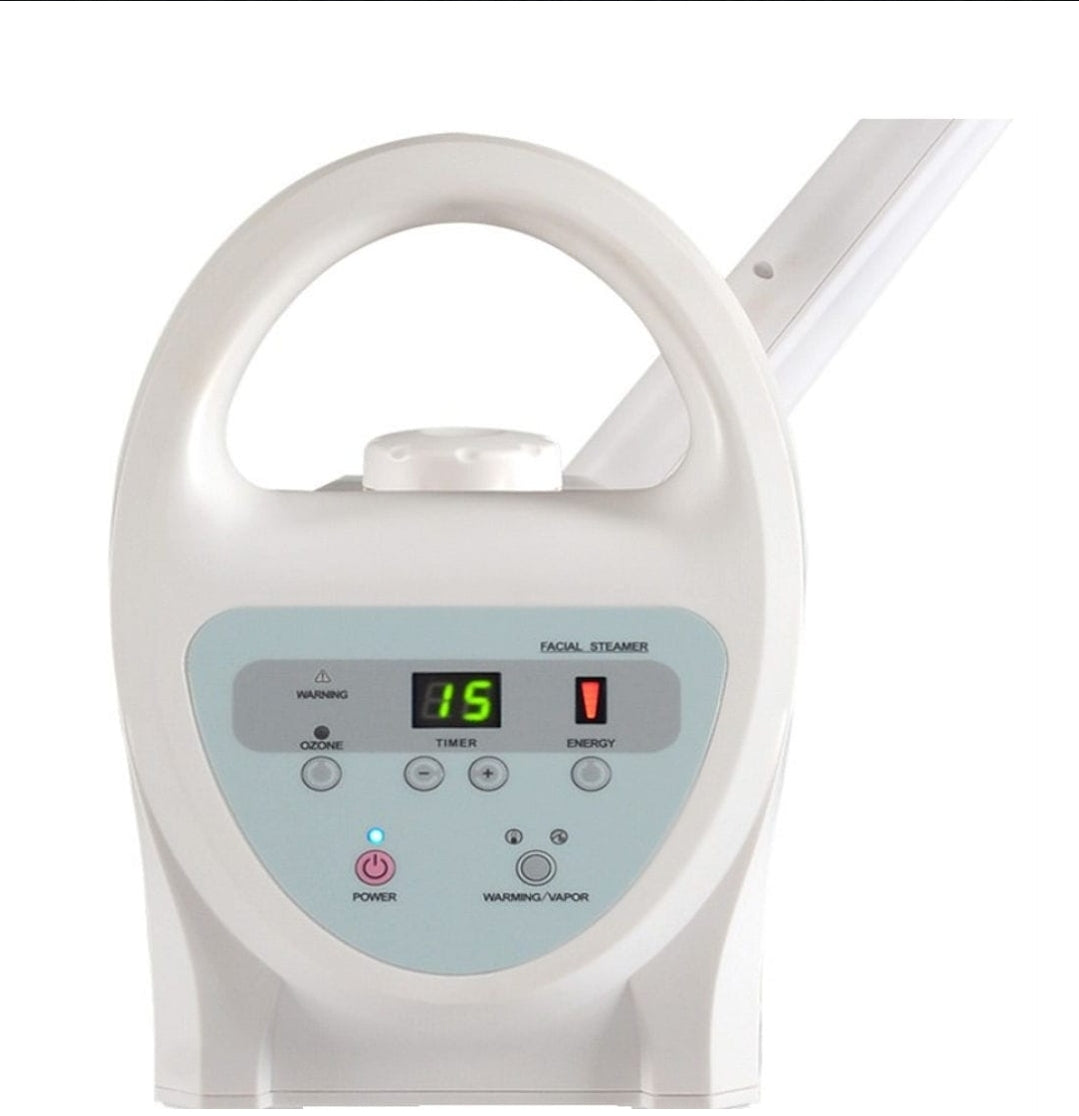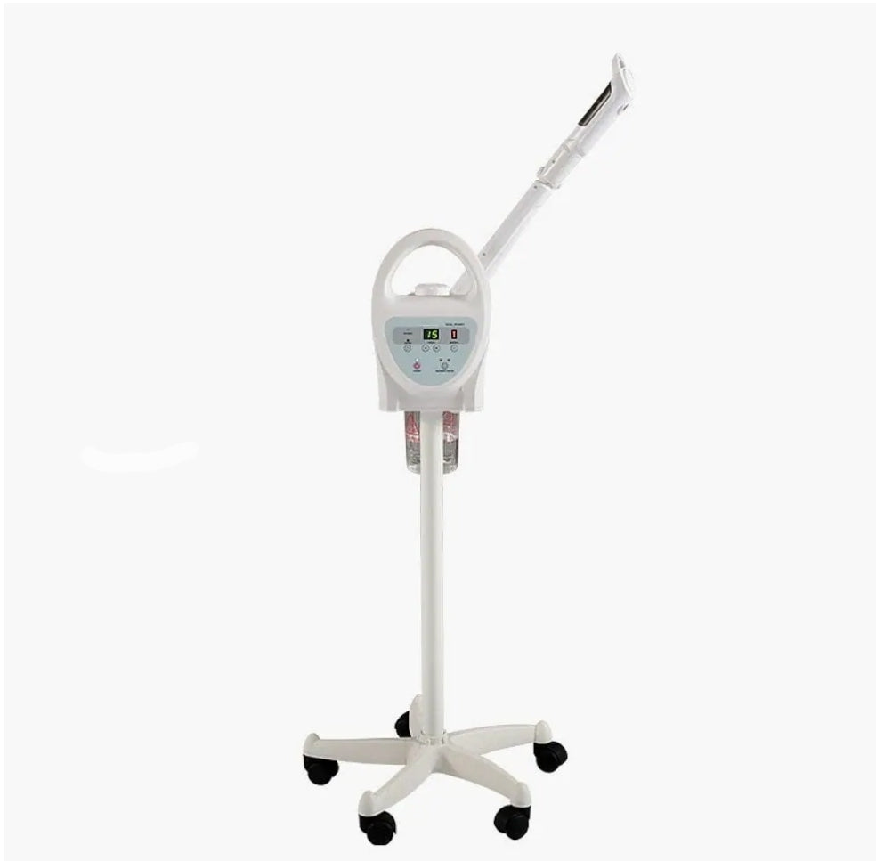 Skinmate Digital Ozone Steamer. A 5 star wheeled based steamer which features a built-in UV lamp and 3 levels of spray volume. The steamer automatically detects the water level, has a thermal insulation function, and comes with a heat-resistant, anti-corrosion water cup for increased safety and efficiency. The spray head includes an essential oil wool felt and can be easily adjusted 360 degrees.